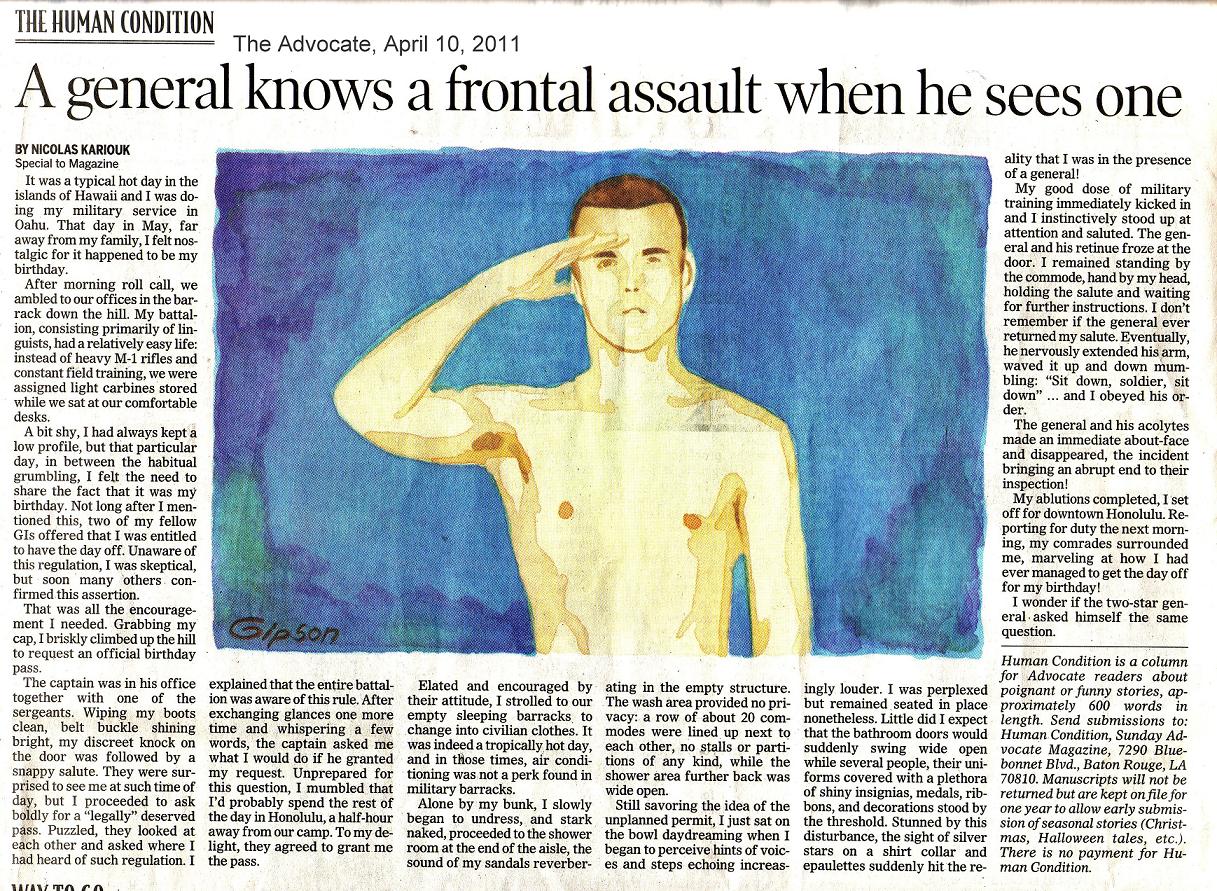 Note: Nicolas was born in France and moved to Chile after WWII. He then moved to the U.S. and was drafted into the Army in 1954. His account along with a story of his friend Ibsen can be read in an article he wrote for "Human Condition" . Nicolas also submitted another article from the Human Condition (4/10/11) entitled "A General Knows a Frontal Assault When He Sees One". This is a tongue in cheek experience of meeting a General while in a barracks Latrine. Nicolas also included a Citizenship Story that is certainly an interesting comparison to the process of receiving citizenship today.