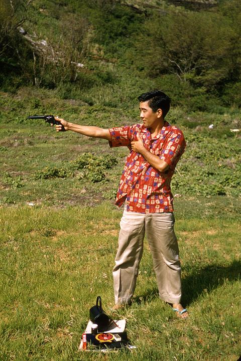 One of the unit artists was George Osaki. George and I were close friends.. He and my wife and I spent a lot of time together on picnics, swimming and just hanging out.. I have a picture of him shooting my revolver. One time Captain Higgebottom failed to close and sign out my safe...The register tablet was on top of the safe.. Well anyway, I spotted his error as I was leaving for the night, I signed out for him.. Next morning he came over and I could see him looking out of the corner of his eye at the pad.. He saw that I had signed it for him and although he never mentioned it, I was his man from then on. Luckily I saw it before the night CQ came on his rounds.