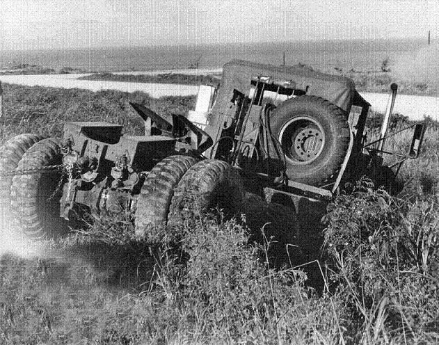 The day the tractors came to pickup our trailers, one lost its brakes and ran off the road down an embankment. It had to be hauled out of the brush by crane.(Picture)
