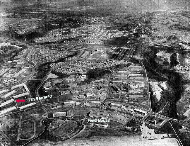 Two hours later after the last man is dropped off it is figured out that unit was the 15th PSYOP Det. I was finally billeted at Ft. Buckner. Second floor of the PSYOP barracks. (Aerial View of Ft. Buckner and Barracks)