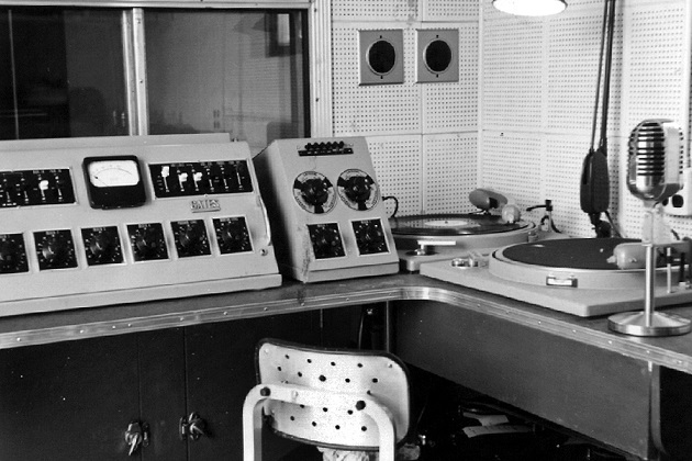 Studio Tape Decks, Teletype and Hammerlund SP-600 Short Wave Receiver. |