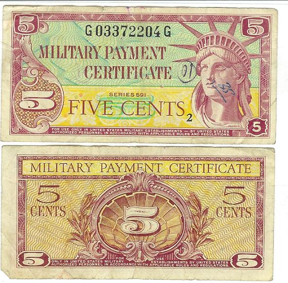The facilities were crude compared to our station on Okinawa.. Most of the equipment, barracks, and mess facilities were in Korean War vintage quonset huts..The huts were heated with oil heaters.. We joked about being treated like Marines since they still used quonset huts at many camps on Okinawa.. On our off duty time, we explored Seoul and learned more world events from the attractive Korean girls who worked at the many local libraries..The library services as well as all other goods and services were paid for with "Monopoly Money" or Military Payment Certificates. . We were not permitted to use U.S. currency in Korea or most other countries visited because of the black market in US dollars.. I saved some of this funny money including a 5 cent MPC .. We were also required to wear fatigue or "Class A" uniforms at all times since civilian clothes were not permitted. There was also a 12 midnight curfew for military as well as civilians.