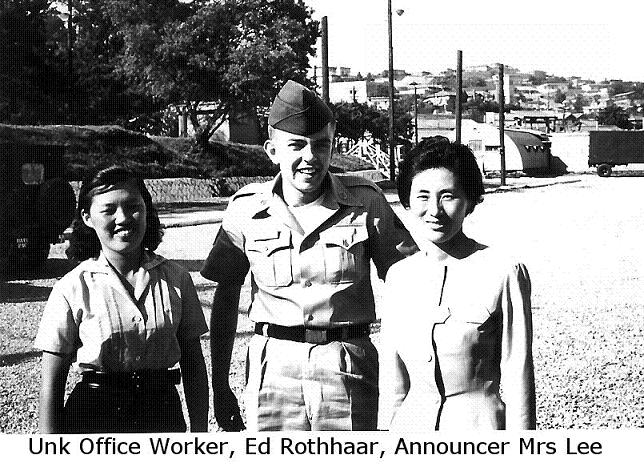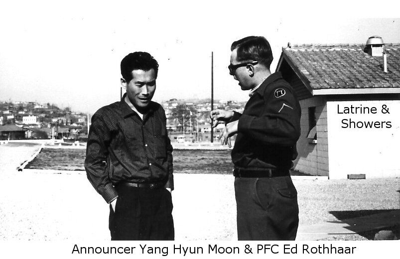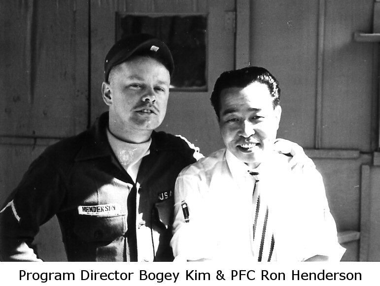 After 7 months at Fort Bragg at the 4th Radio Broadcasting and Leaflet Bn. I managed to bribe a personnel sgt. to get me shipped out to KD. I was a draftee, Pfc. 703 (Broadcast Specialist) and arrived at KD in the fall of 1960. I worked with a wonderful bunch of Korean nationals, most of them announcers and writers and developed some good friendships with them as well as many of the GIs in the unit. Ed Masters was the DOD civilian and was later replaced by another civilian, Lynne Morrow. The CO was Col. Jody Stewart and the company dog was named "Greyboy". The supply sgt. was Sfc. Mikuchonis and Sfc. Charles Baxtresser was a part of our section.