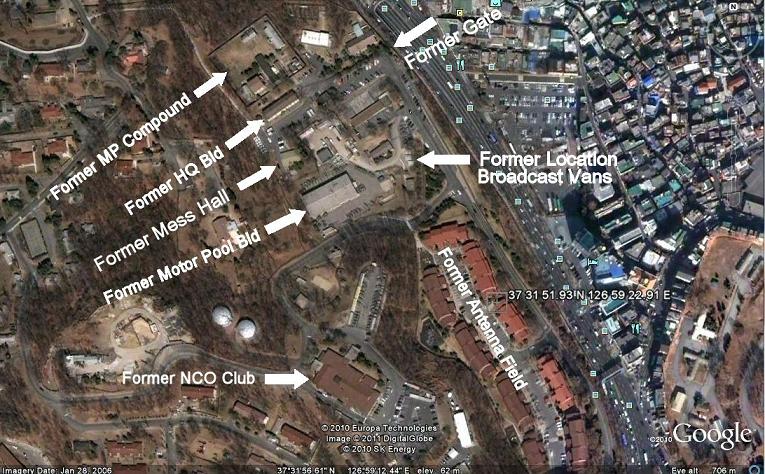 Below: Closer View of site. With the help of Russell, some of the buildings and areas of the former site were located. The buildings labeled as "Former" are probably not the same buildings, but newer buidings at the same location. Note the "dog leg" as seen in the first picture which is the former site of the Broacast Station. It is not known who occupies this present day location. It is possible the site could be an ROK installation. In a closer view with Google Earth, the "Motor Pool Bld" appears to have many vehicles in the lot and could still serve that function.