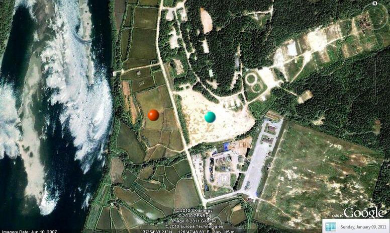 The last image shows a Google Earth closer view of the area which is now rice paddies along the Imjin River. The orange dot shows the location of the former broacast station. The blue dot across the road was the location of the barracks, day room, library, px movie theater, barber shop and mess hall.