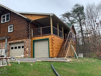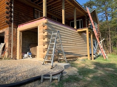 The next two pictures show construction of garage using frame lumber and log siding. Special log end pieces were used to match design of logs in home.
