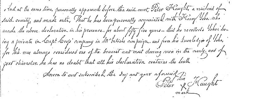 Denver Yoho writes that Jacob took part in the Indian Wars and made a request for a pension. He enlisted at West Liberty VA (now WV) and served five years under Captain McMahon and John McCulloch, was honorably discharged at Dillys Ferry, Ohio (now known as Grave Creek), and appeared on the muster roll of said company. Jacob's pension request was denied on the grounds that neither his name, nor the names of the officers mentioned, could be found on the arm rolls. He made his request on Nov 11, 1850, at the age of 86, when he was a resident of Guernsey County, Ohio. He stated he was a soldier in the company of a Captain McMahon in the regiment commanded by Benjamin Biggs. His pension rejection does not necessarily mean that Jacob Yoho did not serve, due to the fact that by the time the pension legislation was passed many years had elapsed since the wars and many of the men who had served were well advanced in age, making proof of service difficult to ascertain.