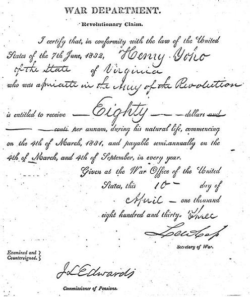 WAR DEPARTMENT Revolutionary Claim I certify that, in conformity with the law of the united States of the 7th June, 1832, Henry Yoho of State of Virginia who was a private in the Army of the Revolution is entitled to receive eighty dollars per annum, during his natural life, commencing on the 4th of March, 1831, and payable simiannually on the 4th of March and 4th of September, in every year.Given at the War Office of the United States this 10 day of April one thousand eight hundred and thirty three. The DOCUMENT was signed by the Secretary of War and the Commissioner of Pensions.