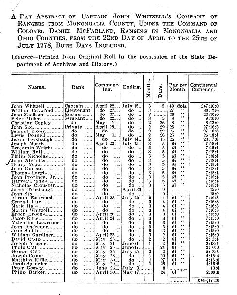 Year 1782 First Battalion, Washington County. Recruited in Whiteley and Green Townships (now Greene County Pa) a few miles from Dunkard. John Guthrey, Captain. Among the privates were listed Peter Yoho and Henry Yoho. These men also served tours with Captain John guthrey and Captain Samuel Swindler, Captain John Minor, Captain Cecil Davis and Captain John Shipman. Service on the western frontier was not continuous. Soldiers would be discharged at the end of an emergency and called back when an emergency would occur.