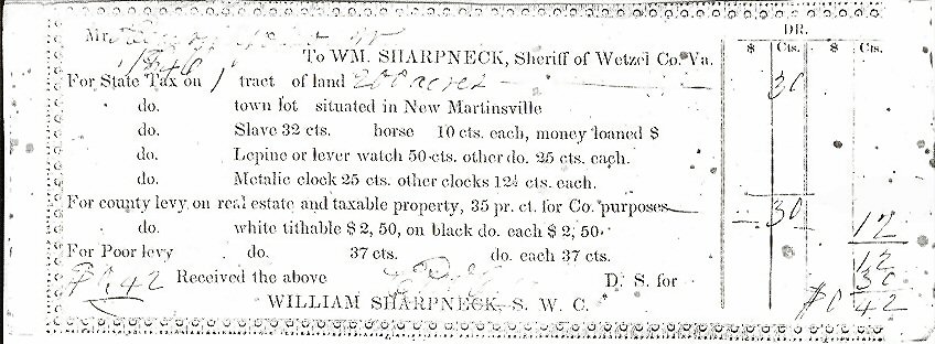 Mr. Henry Yoho To WM. SHARPNECK, Sheriff of Wetzel Co. Va. For State Tax on 1 tract of land 200 acres....................$0.30do. town lot situated in New Martinsville do. Slave 32 cts. horse 10 cts. each do Lepine or lever watch 50 cts. other do. 25 cts. each do. Metalic clock 25 cts. other clocks 12 1/2 cts. each....0.12