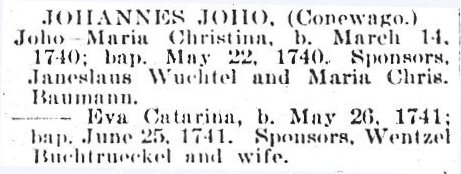 John Yoho son of Johannes was born in 1746. I have found very little information about John and ask that any information be sent for inclusion in his history. I do not have his death date, where he is buried and who he married. The ancestors of John have mostly settled in Western Pennsylvania.