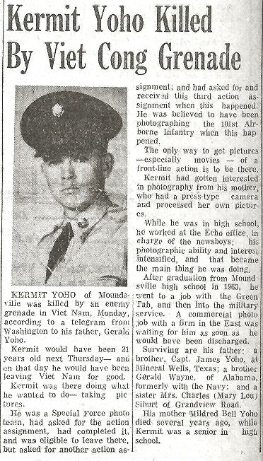 One DASPO member stated: " Seven civilian correspondents and photographers have been killed in South Vietnam since the French debacle there in the early 1950's". "Had Specialists Yoho been a civilian photographer working for a US wire service agency, his death would have been recorded on the front pages of most major American dailies". Kermit's name appears on the Viet Nam Memorial Panel 05E Line 024.