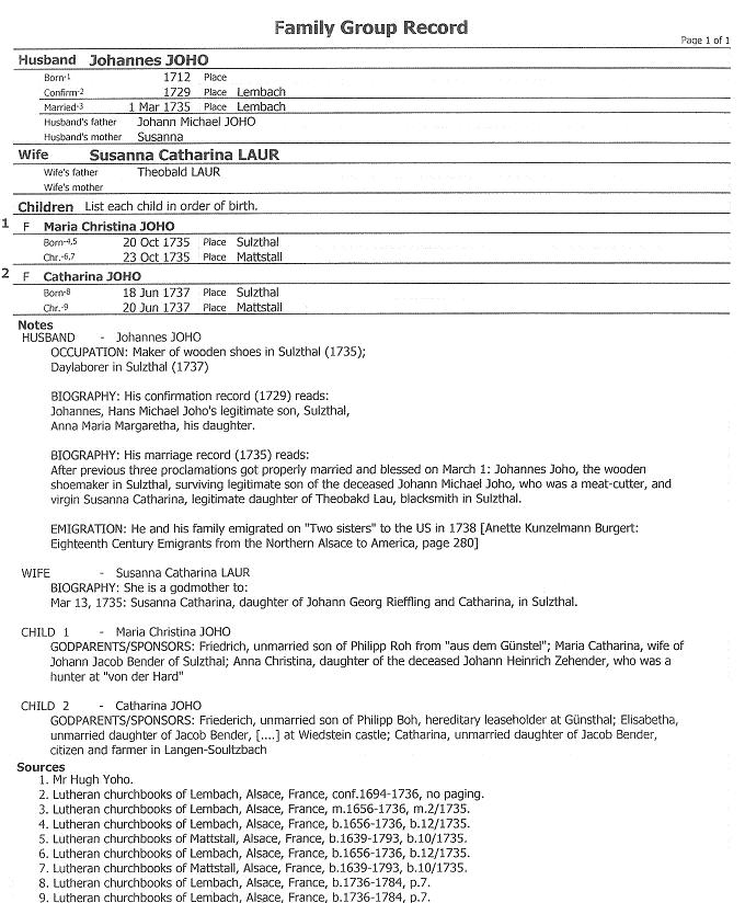 In early 2005, Hugh Yoho and I discussed hiring a European genealogist to do further research on the origin of Johannes (John) Michael Joho and his family. . Family traditions and investigations by Denver Yoho and others reported that Johannes Michael lived in Sulzthal near Lembach Alsace in the early 1700's but his place of birth was not known. . Johannes Michael married Susanna Gelker (location unknown) and they reportedly had four children in Alsace. One of those children, Johannes Joho emigrated to America and is the ancestor of most of the Yoho families living in the U.S.