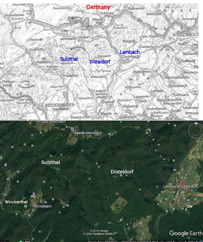 Mr Porten's investigation did reveal that Sulzthal was not a village but a farm located near Lembach in Alsace. Maps of the Sulzthal location appear below in Porten's report. Evidently this farm was home to a number of families including Johann Michael Joho.